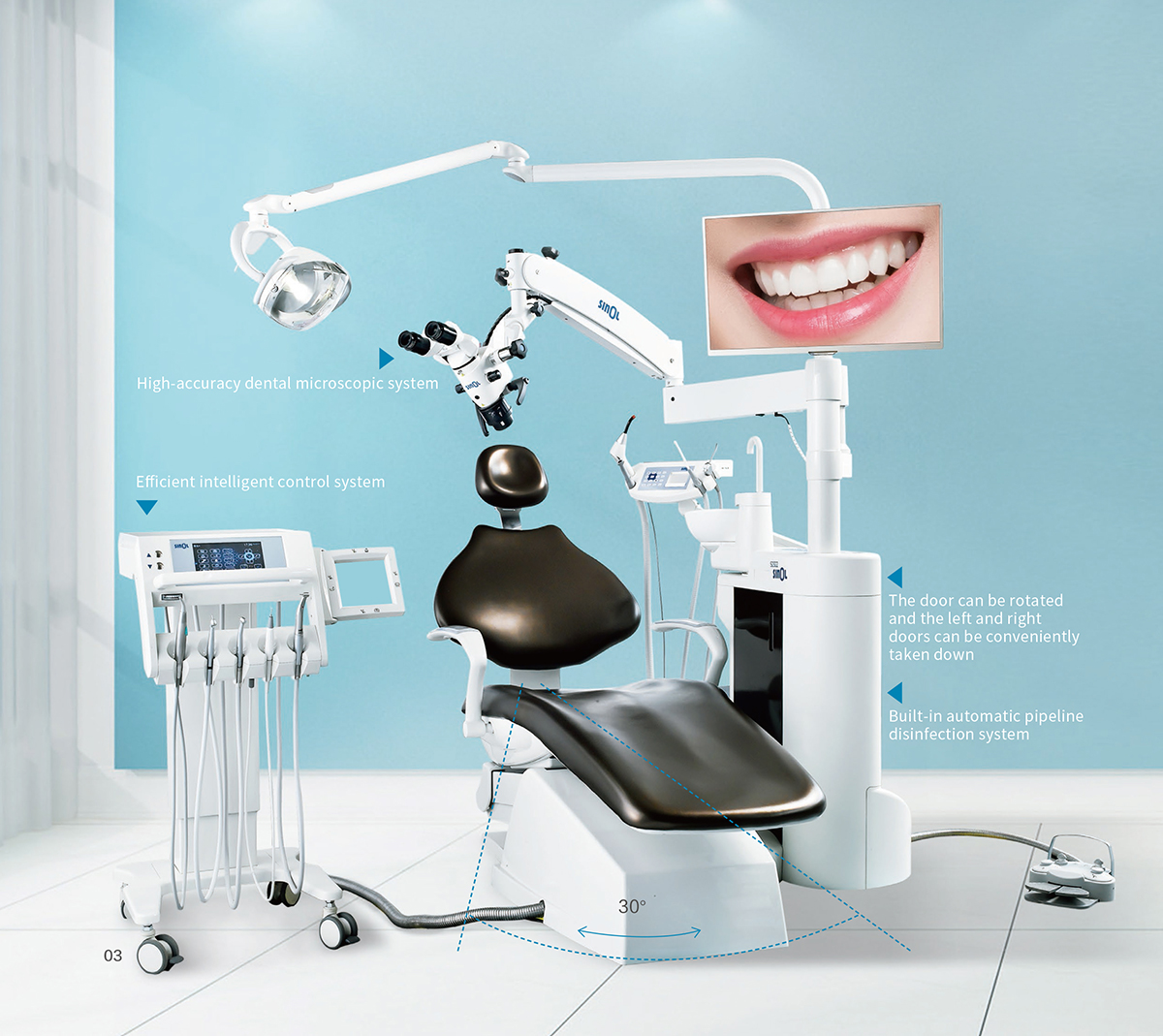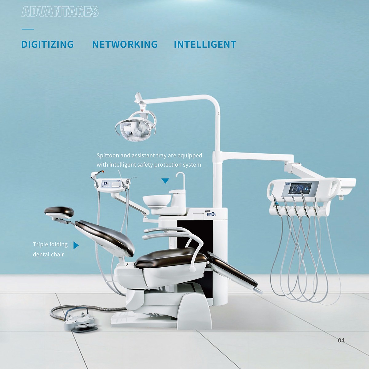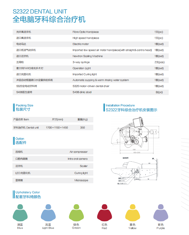 The S2322 Dental Unit is controlled based on an embedded intelligent operating system, which embodies the characteristics of product digitalization, networking, intelligence and comfort. It can perfectly achieve data interaction and sharing, and provide accurate and comfortable treatment for dental treatment use;